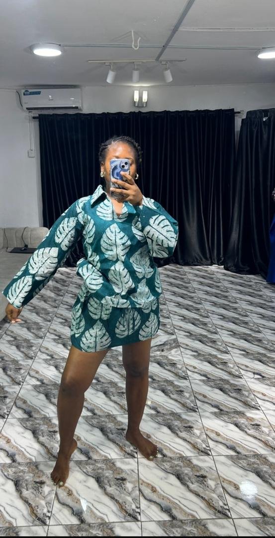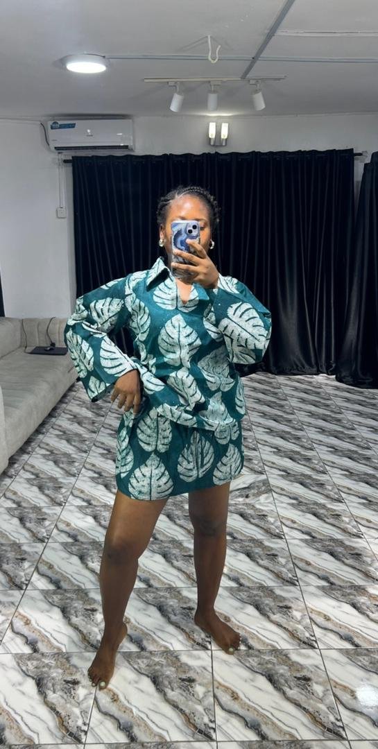 Stand out in this stylish Adire two-piece set made from breathable cotton. Featuring a vibrant green and white leaf print, this outfit includes a flattering mini skirt and a relaxed-fit top with long sleeves — perfect for casual and semi-formal looks.