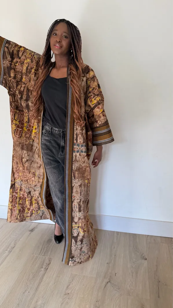 Wrap yourself in culture and elegance with the Adaora Heritage Flow Kimono, a striking blend of contemporary style and African tradition. This longline kimono features a richly patterned Adire base, adorned with bold Aso Oke stripes on the sleeves and trim, creating a beautiful contrast that celebrates Yoruba craftsmanship.