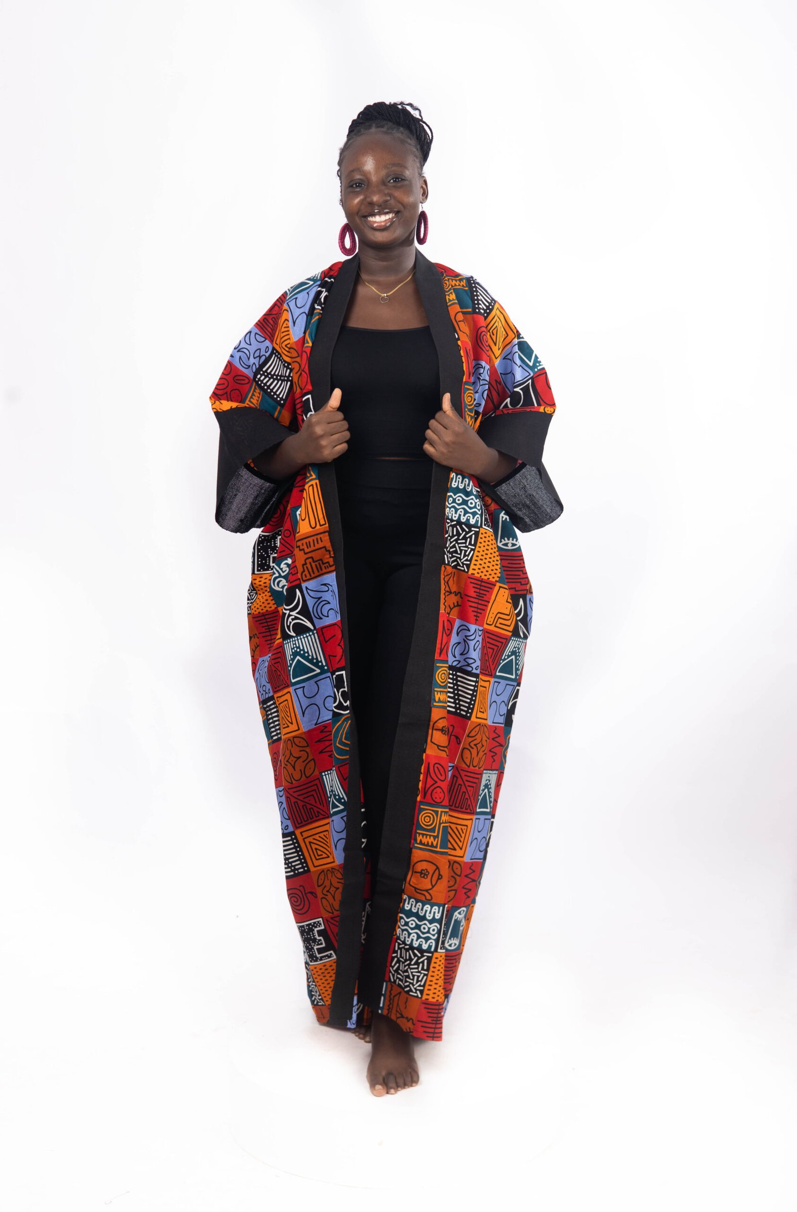 The Tribe Flow Maxi Kimono is a celebration of culture and craftsmanship. Made from 100% cotton Ankara fabric, it features traditional tribal patterns in vibrant colourways designed to stand out. Lightweight and breathable, it’s perfect for layering year-round.